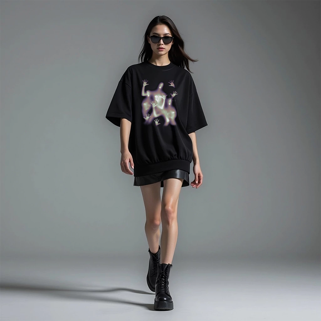 As estampas da linha Heavy Oversized Humbre têm design exclusivo e conceitual, destacando-se pela arte contemporânea com efeitos de movimento e distorção visual, ideal para quem busca exclusividade e um estilo sofisticado.